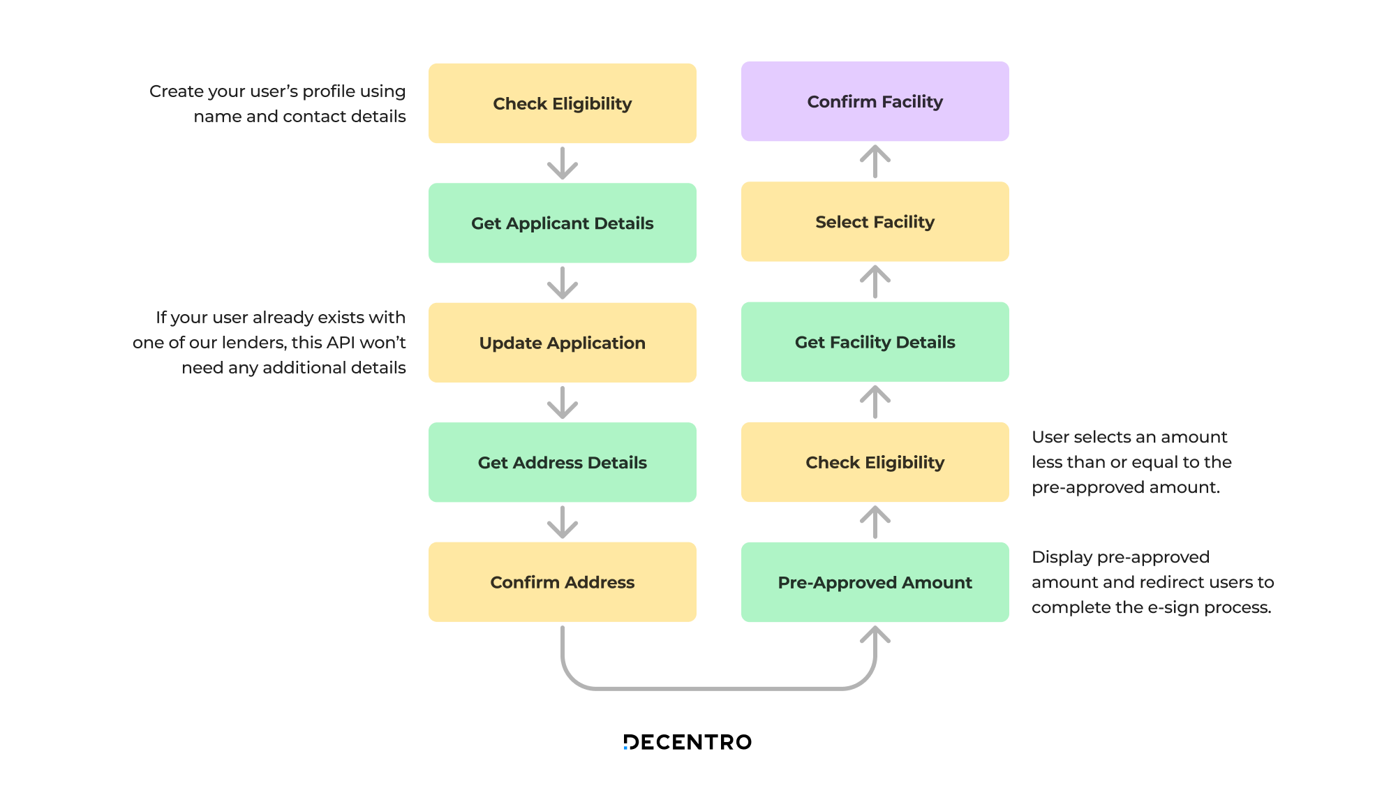 This single API lets companies complete an eligibility test against an applicant and complete the entire loan disbursement process via a redirection to a fully managed lending UI.