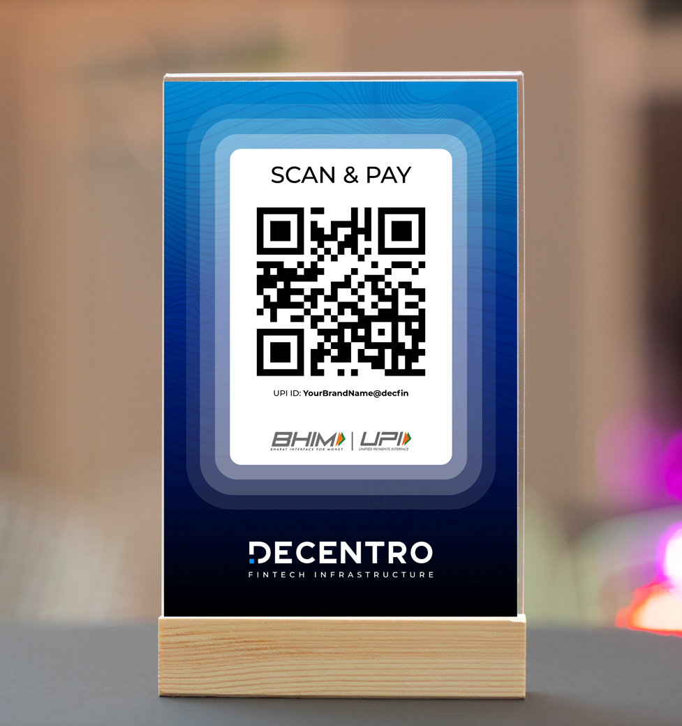 - After the onboarding process is completed, Decentro will issue a newly created VPA (UPI Id) and a static QR code standee to the merchant.